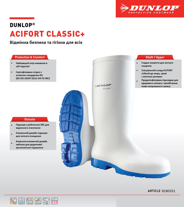 Захисні чоботи нідерландського бренду Dunlop Acifort Classic+ стануть незамінною частиною робочого спорядження. Вони мають ідеальний баланс між безпекою та функціональністю, що робить це взуття ідеальним вибором для професіоналів харчової галузі. Також ця модель може стати чудовим варіантом жіночого робочого взуття, оскільки має менші розміри.